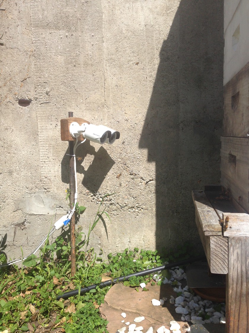 Hive on April 29, 2018, started from a captured swarm from Jack Ip of Los Altos Honey Bees in July 2017. Camera details.